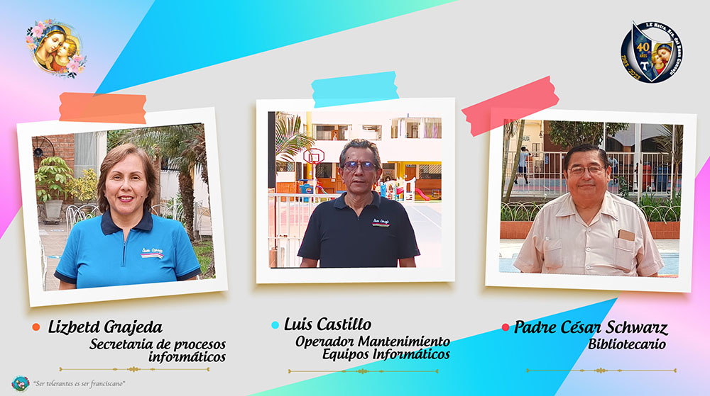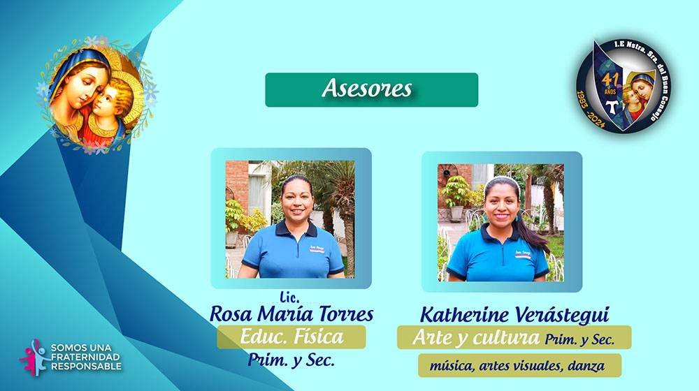 PERSONAL DIRECTIVODirectora GeneralSor Juana Jorge GarcíaSub Directora AdministrativaSor Emilia Santos SantosEquipo Directivo Item de carrusel 01Directora GeneralSor Juana Jorge GarcíaItem de carrusel 02Sor Emilia Santos SantosSub Directora AdministrativaItem de carrusel 04Lic. Rosa María Torres TorresJefe de Norma y ConvivenciaCoordinadora de TutoríaItem de carrusel 03Juan Antonio Ruiz GutiérrezCoordinador de PastoralCoordinaciones Item de carrusel 03Mg. Lourdes Echavigorín VargasCoordinadora de 5to de primaria a 5to de secundariaItem de carrusel 04Mg. Mónica Dávila Paz Coordinadora de Inicial a 4to grado de PrimariaCoordinadora de ActividadesItem de carrusel 02Juan Antonio RuizCoordinador PastoralPersonal Educativo Inicial Primaria Secundaria Administrativo Asesorías